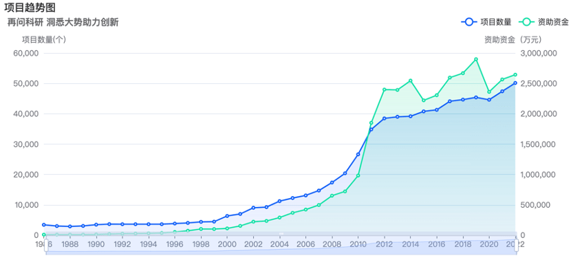 依据查询结果,提供了该查询条件下历年资助项目数量与资助金额的发展趋势,一目了然。