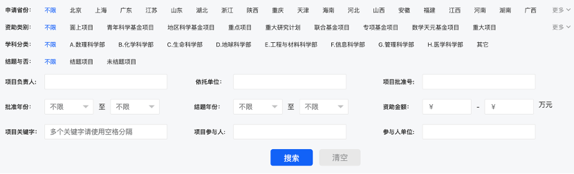可供查询的维度丰富,无查询限制;比较特色的维度是:省份、结题与否、结题年度、项目参与人等。