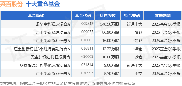 根据2025基金Q3季报公募基金重仓股数据,重仓该股的公募基金共7家,其中持有数量最多的公募基金为银华基金的银华富利精选混合A。银华富利精选混合A目前规模为17.23亿元,最新净值0.579(12月31日),较上一交易日下跌0.82%,近一年上涨0.87%。该公募基金现任基金经理为焦巍 秦锋。焦巍在任的基金产品包括:银华富裕主题混合A,管理时间为2018年12月27日至今,期间收益率为104.78%;银华富饶精选三年持有期混合,管理时间为2021年5月28日至今,期间收益率为-37.08%;银华富久食品饮料精选混合(LOF)A,管理时间为2021年9月3日至今,期间收益率为-44.09%。秦锋在任的基金产品包括:银华中证全指医药卫生,管理时间为2017年9月28日至今,期间收益率为27.07%;