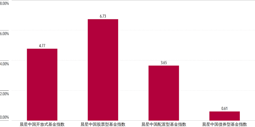 代表全部基金产品表现的晨星中国开放式基金指数在1月录得4.77%的涨幅,各类型基金指数集体收涨。其中,受股市和债市良好表现的提振,晨星中国股票型基金指数、晨星中国配置型基金指数和晨星中国债券型指数分别录得6.73%、3.65%和0.61%的月度涨幅。