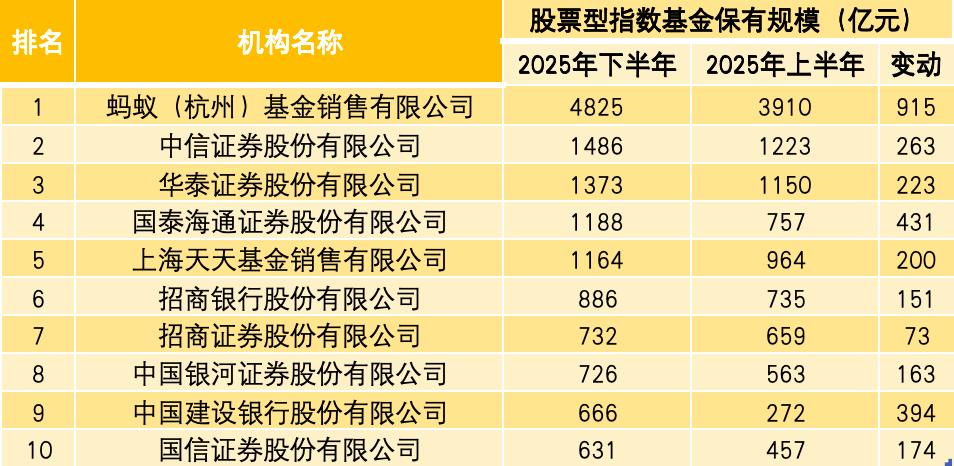 再看股票型指数基金保有规模维度,前五名依次为蚂蚁基金、中信证券、华泰证券、国泰海通证券以及天天基金。其中,蚂蚁基金依旧以4825亿元的保有规模遥遥领先,较2025年上半年增加了915亿元;国泰海通证券的保有规模增量紧随其后,环比增加了431亿元,反超天天基金。