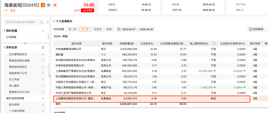 海康威视近日发布的一季报显示,截至一季度末,重阳战略才智基金新进该公司前十大流通股东名单,期末持股数量为5356.5万股,与持有海康威视多年的高毅邻山1号远望基金“同框”。