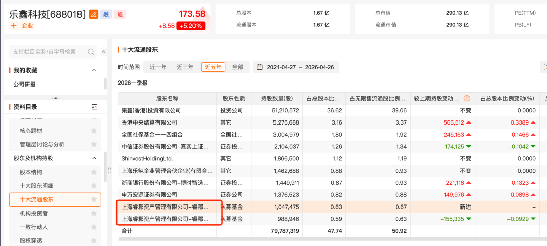 乐鑫科技近日发布的一季报显示,截至一季度末,睿郡资产旗下睿郡有孚1号私募证券投资基金和睿郡有孚3号私募证券投资基金位列该公司前十大流通股东名单,相较于2025年末,前者小幅减持15.5万股,但是后者新进该公司前十大流通股东,合计持股数量为203.64万股。